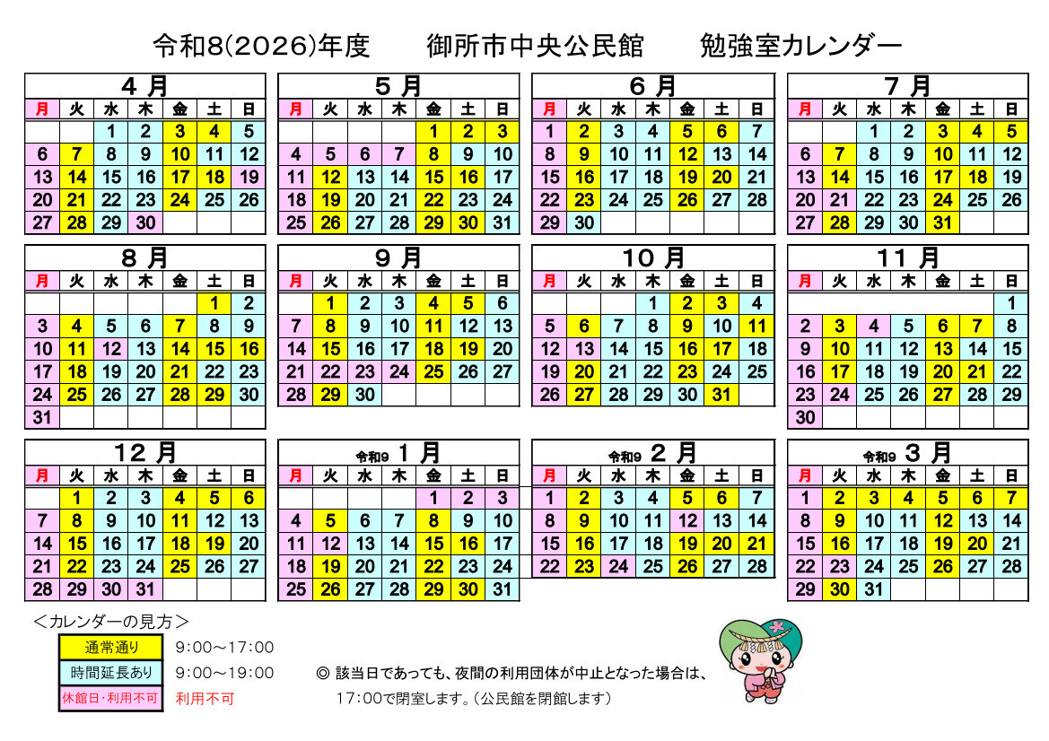 公民館の夜間利用がある日に限り、勉強室(自習室)の利用時間を延長します。時間延長日は、下記の「勉強室カレンダー」をご確認ください。