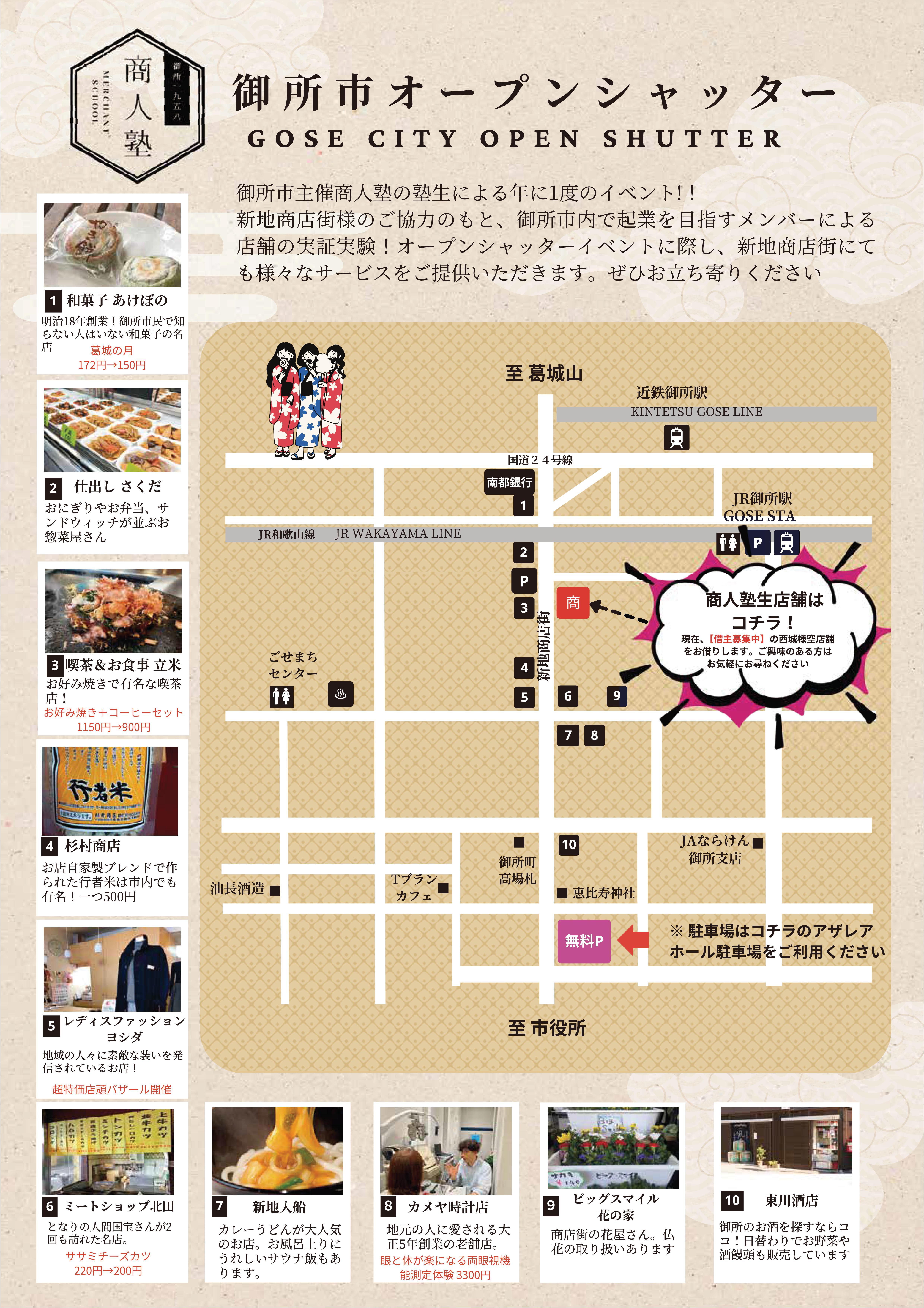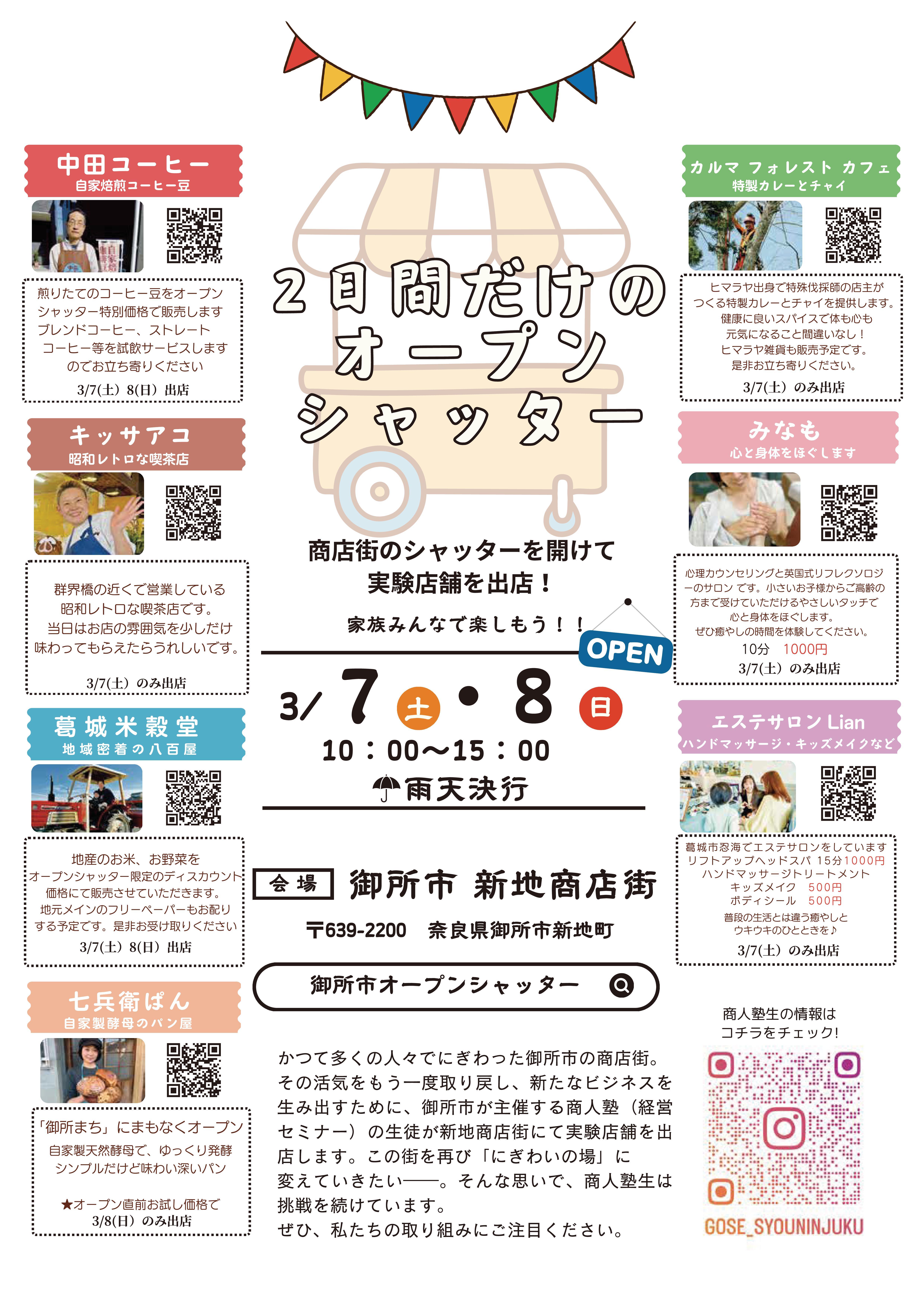 御所駅前の新地商店街にて、空き店舗を家主からお借りして、2日間の期間限定で空き店舗のシャッターを開けて店舗実施実験を行う「2日間だけのオープンシャッター」を開催します。