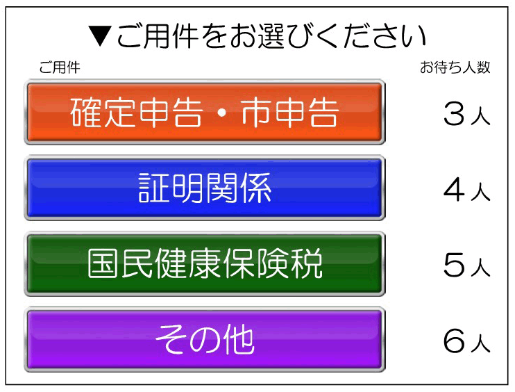 - 発券機でご用件に該当するボタンを押し、番号札を発券します。
