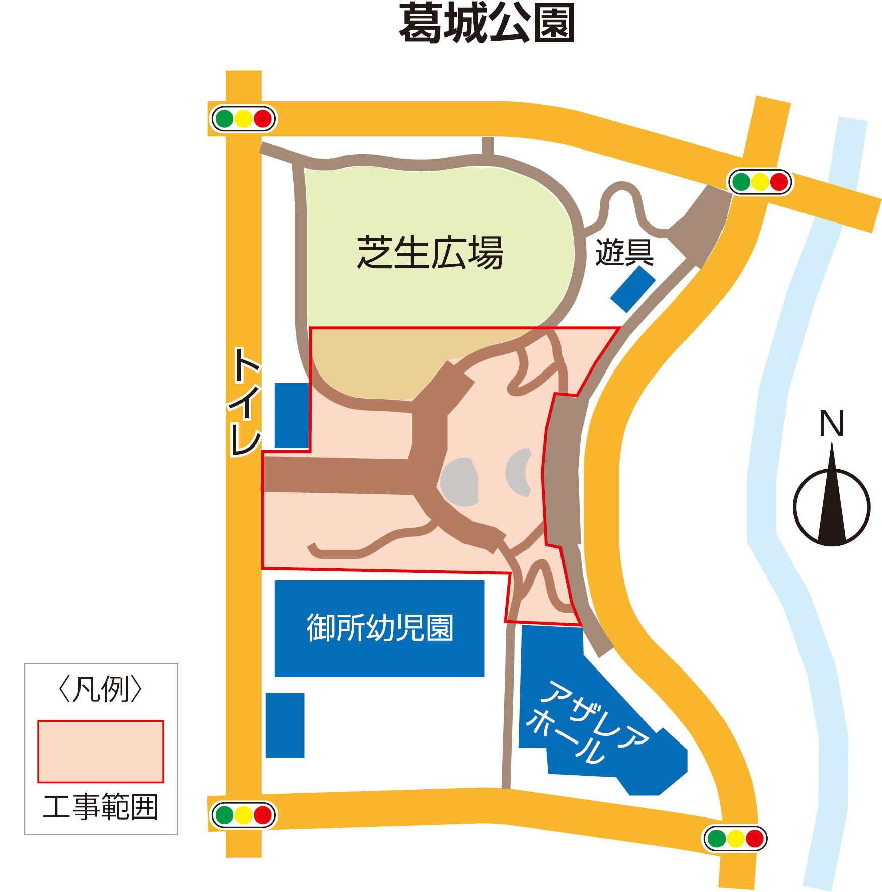 葛城公園では上記の期間、バリアフリー改修工事を行います。これに伴い、期間中は公園南側が利用できず、公園内の通り抜けもできません。